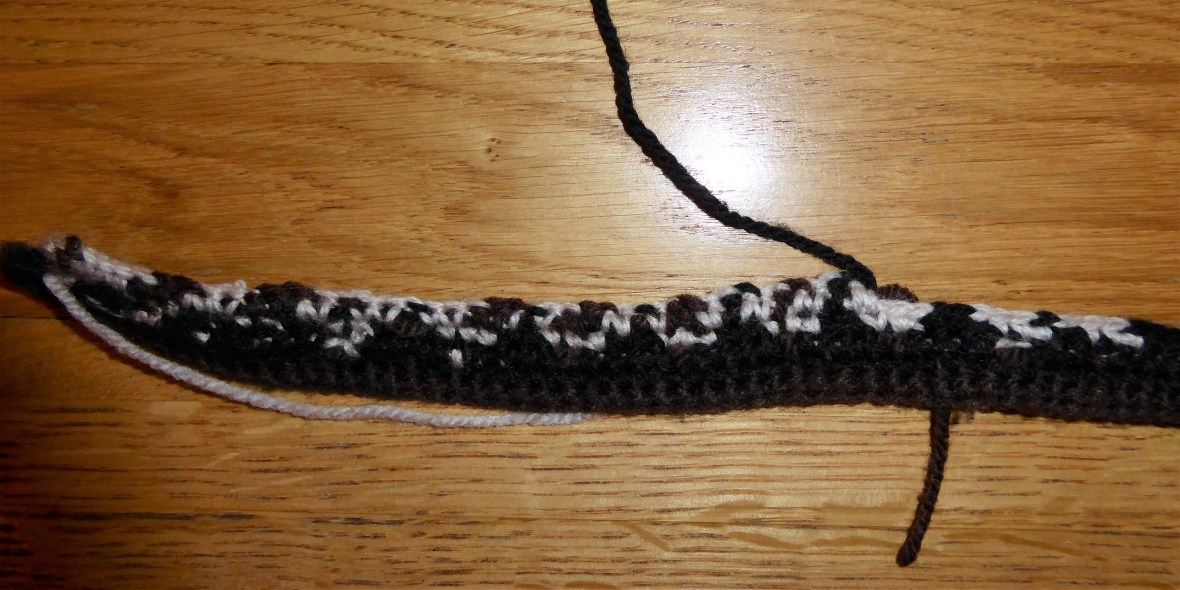 Next bright idea: make the snake lengthways (starting from the middle). Then the central stripe will be straight. Abandoned because I still couldn’t get the diamonds right and the Vs of the crochet stitches don’t point down the snake’s body this way.