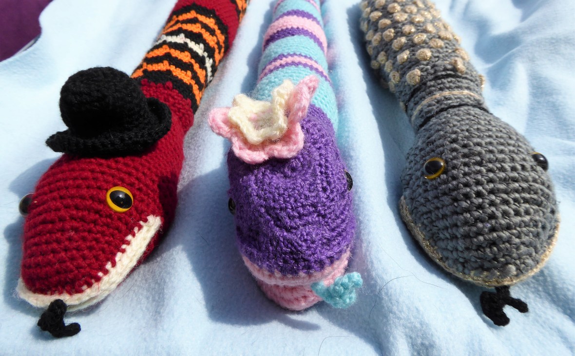 Spike is even simpler than Blossom. He’s the first one I made with a closed mouth, but I couldn’t resist giving him a little hat. He’s made using crochet spike stitch. His head and body were made separately as I wanted the spikes to go down his body, not up. So I worked his head down from the nose, and his tail up from from the tip, then joined at the neck.