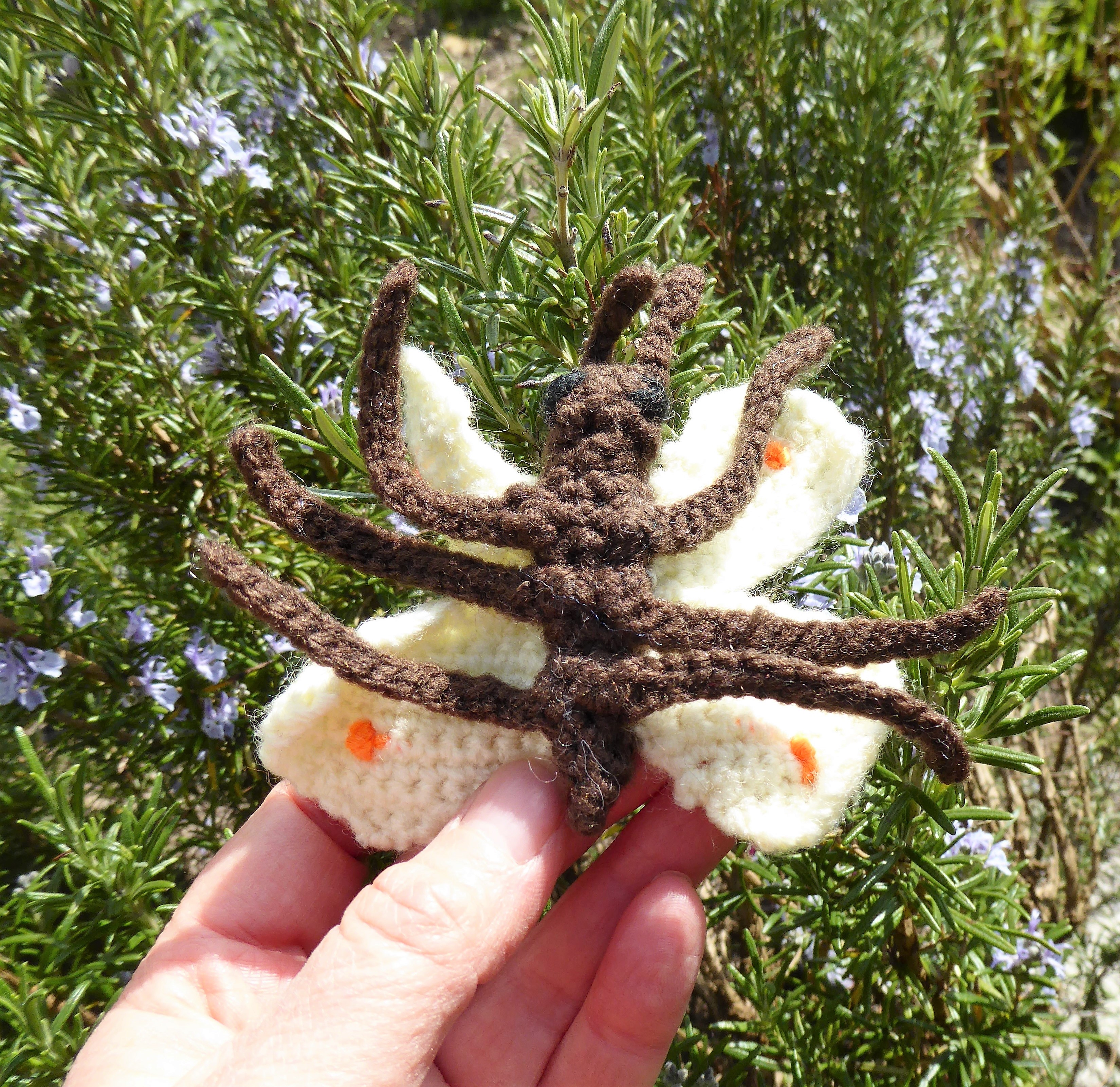 P1040757 April 17, 2017 • 3299 × 3203 • Brimstone Butterfly Underneath. Each leg sewn on seperately. Would be easier to just slipstitch across the body and then chain on a new leg.