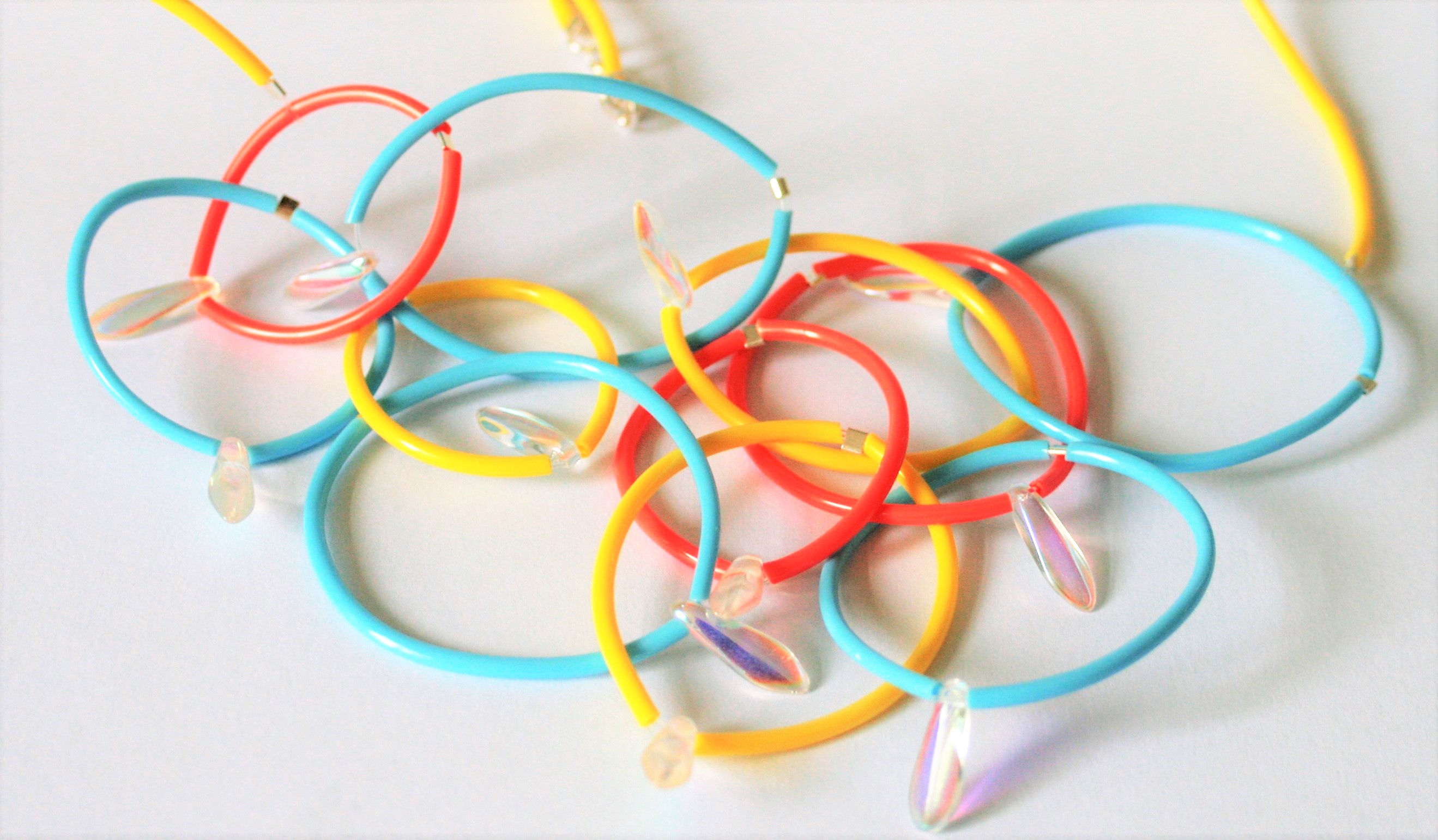 Scoubidou is soft and wants to curve, so how about some loops? Fishing line runs through them and the loops are closed and fixed with little silver crimp beads. Have some bigger crimps on order to just squish the tubes and get rid of the fishing line.