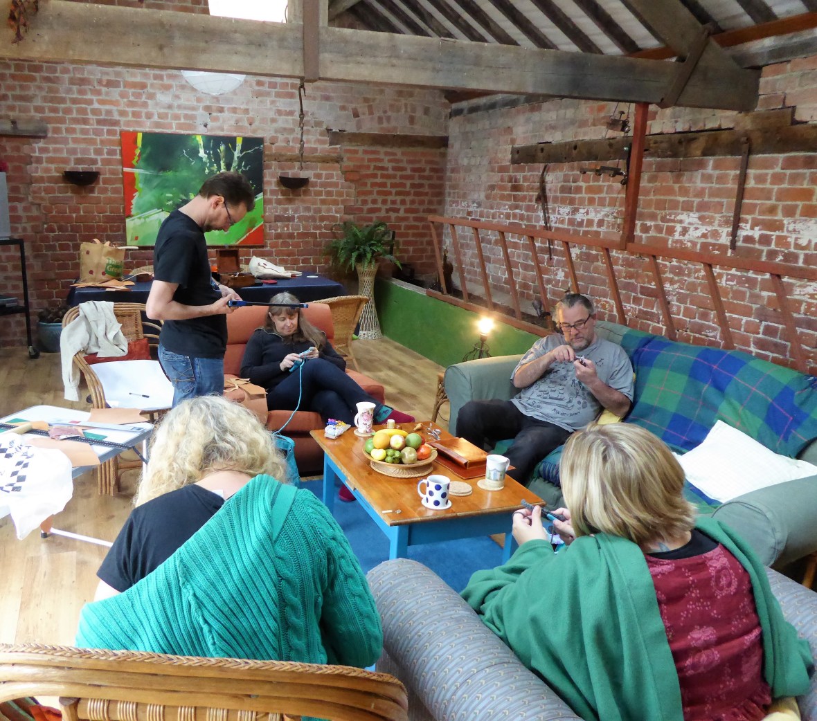 Crafty August 25, 2017 • 4156 × 3672 • Wot I Did on My Holidays When it poured down, there was a whole lot of crafting going on in the summerhouse. Very satisfying with the doors wide open, the light pouring in, the sight of the misty hills and the sound of the rain pattering in the courtyard outside.