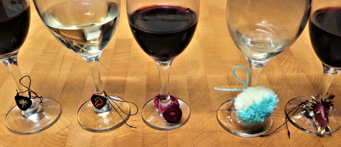 Charming August 26, 2017 • 4423 × 1908 • Wot I Did on My Holidays Our last night. There was a running challenge to create wine charms. Left to right : Clare and Duncan’s leather charms, Gaie’s braid and button, my pompom, Dave’s miniature leather mask. Cheers all! It was a lovely holiday.