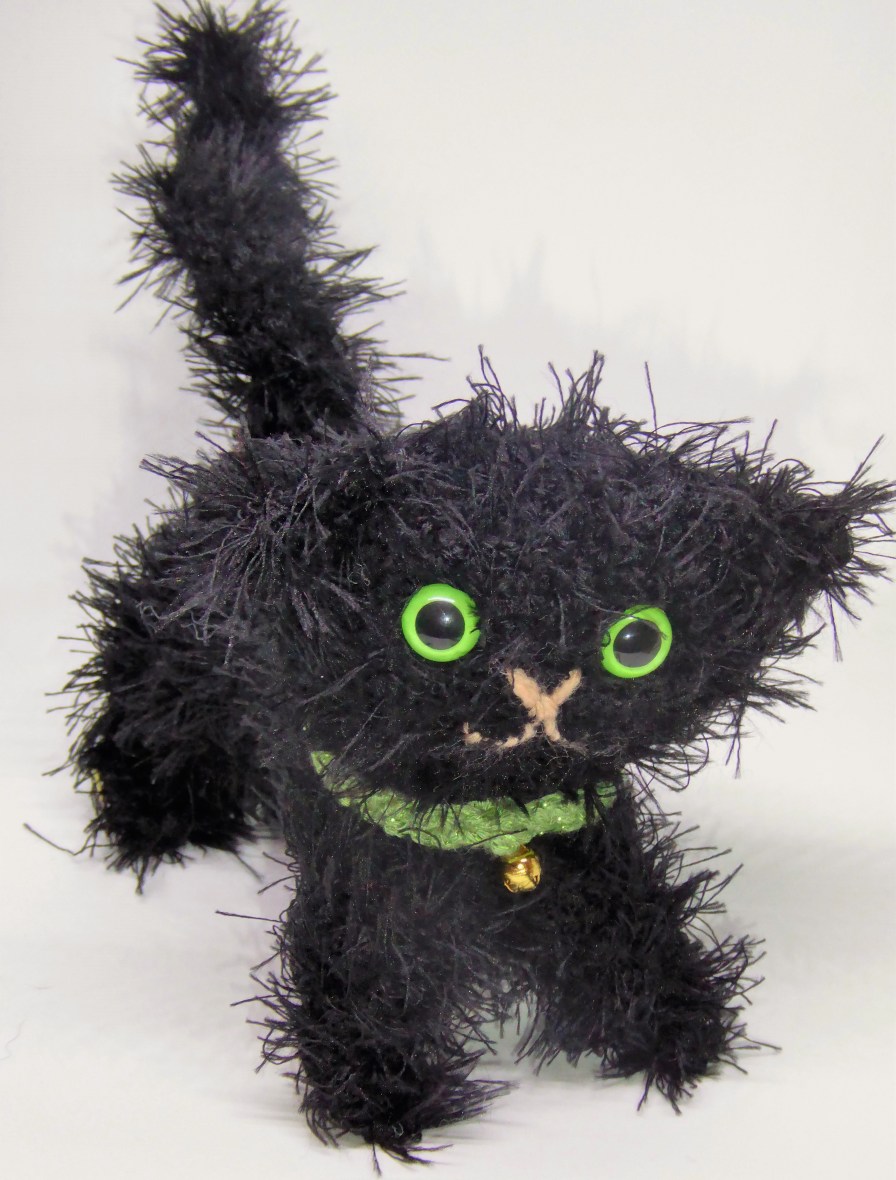 Hobb March 2, 2018 • 3448 × 4543 • Ten Cats Crochet cat #5, Hobb. She has glow in the dark eyes. Also, a long body so something went awry with the stitch count there. I thought I remembered the pattern, but clearly not.