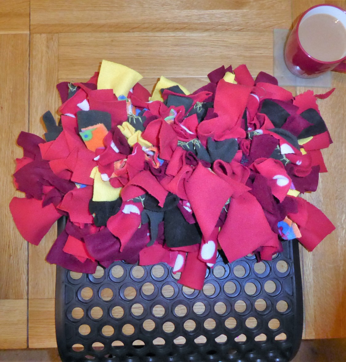 I cut these strips very sloppily, but pretty fast. The Hellbeast doesn’t care, and this doesn’t count as home décor, so I didn’t care either. It’ll do what it’s supposed to. I cut a 10″ wide strip, then folded it, concertina-fashion to make 3 ” wide strips, then cut them up the sides.