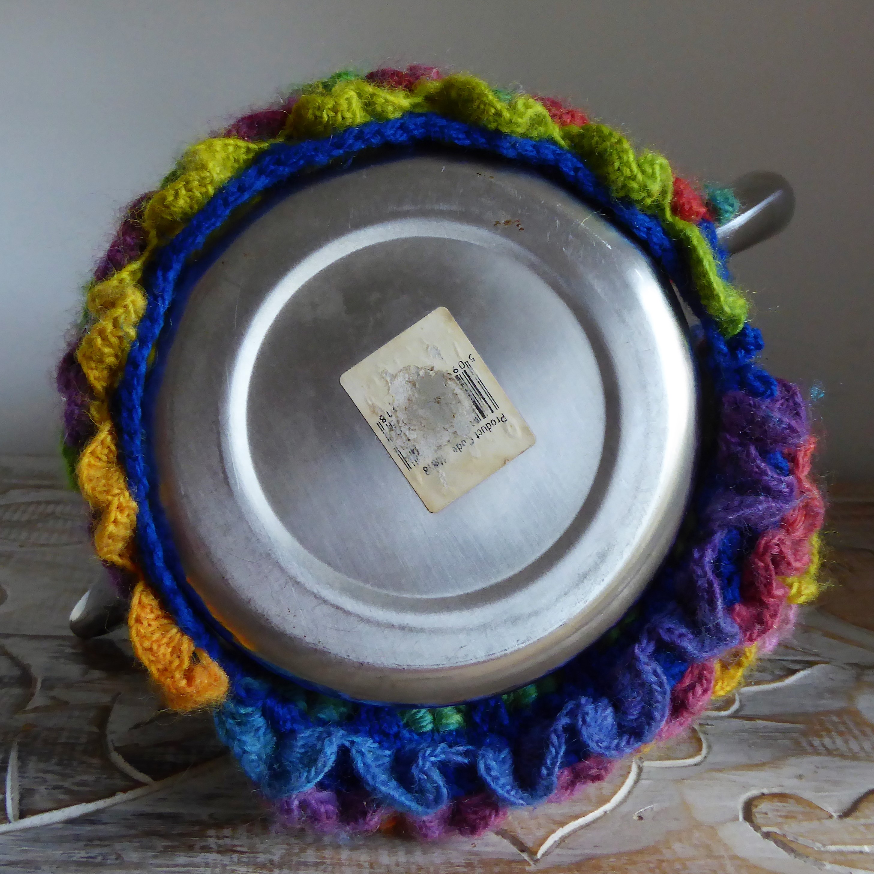 Not So Glam July 16, 2018 • 2914 × 2912 • Rainbow Mermaid Cat Tea Cosy Showing the bottom of the pot. I sewed the tubular dragon stitch closed at the bottom.