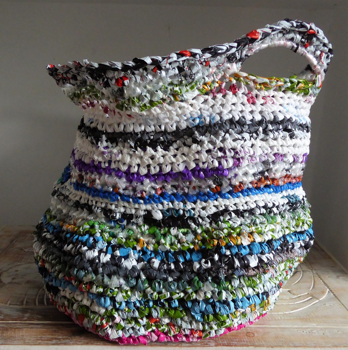 Spike July 20, 2018 • 3077 × 3093 • Pompoms and Handles At the edges of the handles, I crocheted over two rows (spike stitch) to reinforce the plastic.