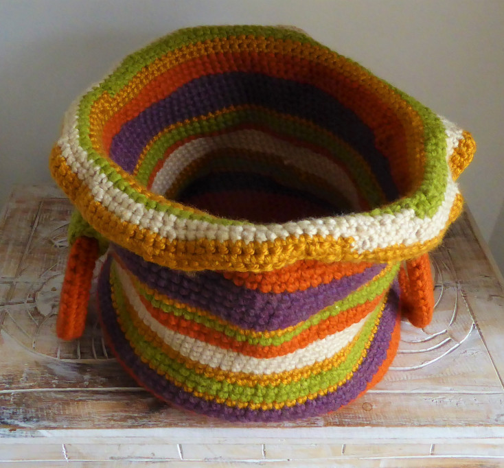 Gold Stripe January 14, 2019 • 734 × 682 • Happy 2019! The person who bought the purple stripe basket wanted another one. By now I had discovered that chunky yarn comes in metallic colours!