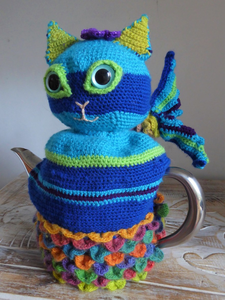 Cosy January 14, 2019 • 3113 × 4151 • Happy 2019! A teacosy made for friends, that ended up being a rainbow mercat. Working the shaping in dragon scale stitch for the tail was challenging, but I like the way she turned out.