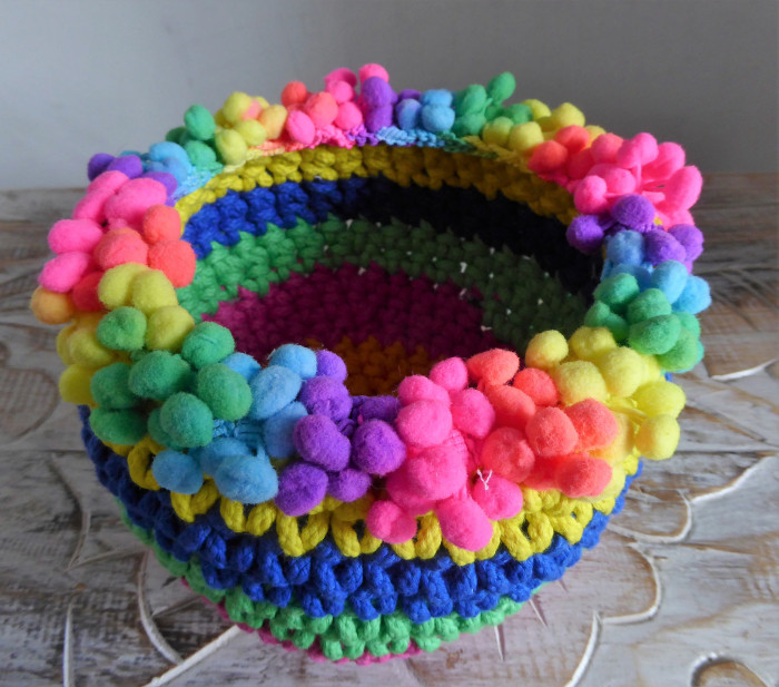 Rainbow Pompoms January 14, 2019 • 700 × 617 • Happy 2019! First experiment with cotton cord. Makes a nice sturdy basket, but too expensive to be feasible for shop items.