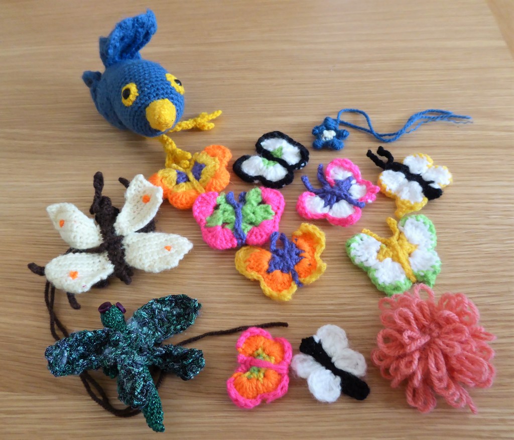 The butterflies were the result of experimenting with creating my own pattern for them, starting with the simplest possible. The bird, dragonfly and loopy carnation were freestyled.