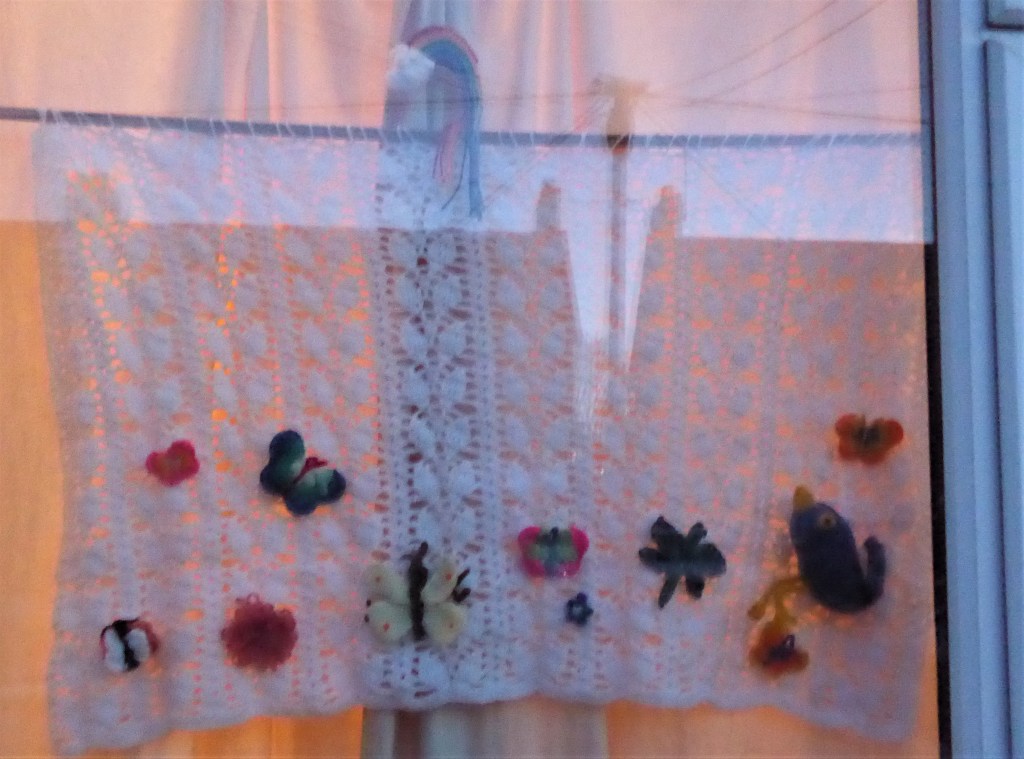 It took me a while to get the hang of, a few false starts to find the right size hook, and a fair bit of working and unravelling and re-working to get it to a usable size. So it was day 12 (April 3rd 2020) before I had a big enough piece to hang in the window.