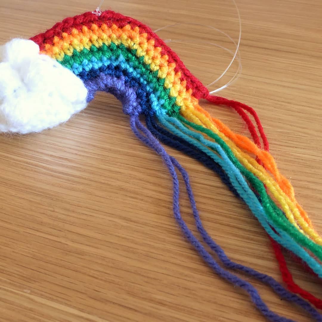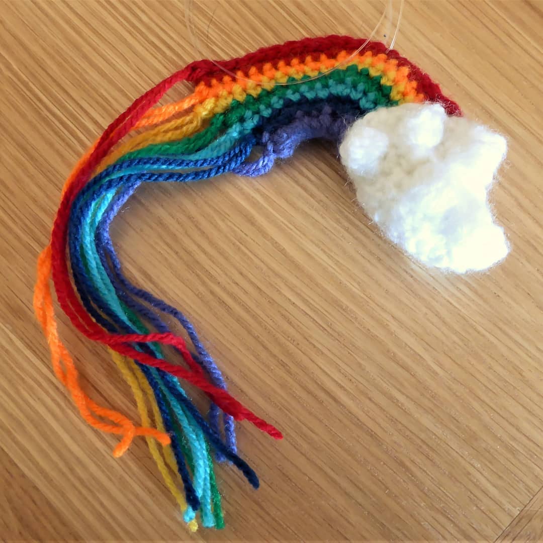At the end of lockdown day 12, I hung it in my window (with some help from my partner, yarn, and a bamboo stick from the garden shed). It looked a lot smaller and more amateurish than I’d wanted, but I hoped the bright colours would still cheer folks up.