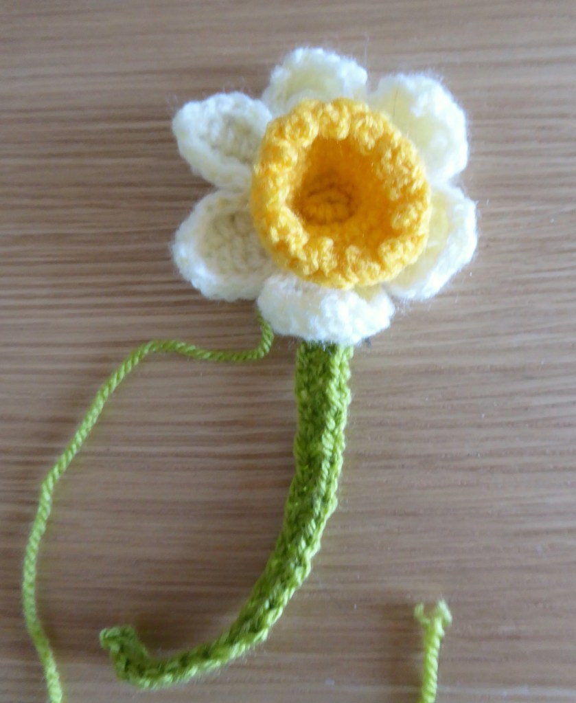 I did use an incredibly useful technique for making the daffodil leaves. Do you hate working into long foundation chains? I do. This magical tutorial (US terminology) by Creatiknit shows you how to make your foundation row and your first row at the same time!** It’s shown for UK treble/US double crochet, but you can adapt it to any stitch.