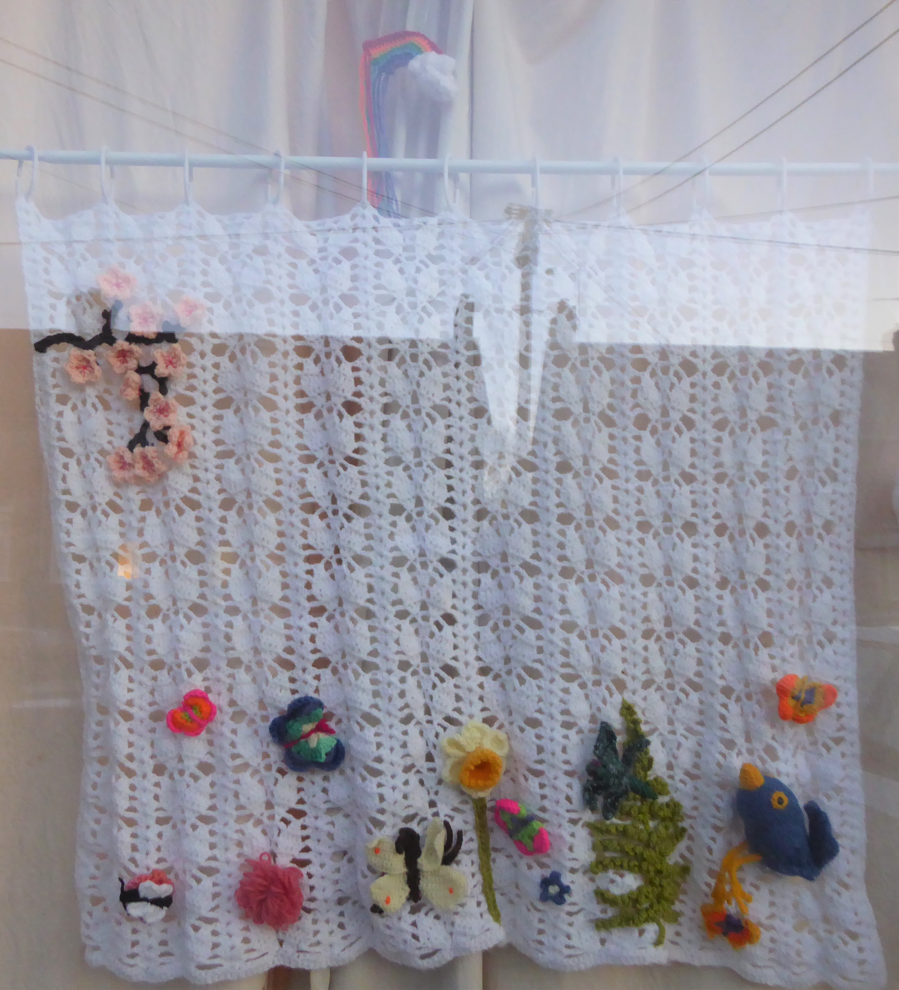 Spring makes me think of blossom. On day 15 I kept it simple with a sweet sakura (cherry blossom) pattern from The Make and Do Crew. (I was also still growing the background by one leaf motif repeat per day.) I used a little simple freestyle to make some branches. I also upgraded to a tension spring curtain rail (instead of the random bit of old beading from the shed and hook and strings that I was using to hang this). This was one of the few purchases I made for this display.