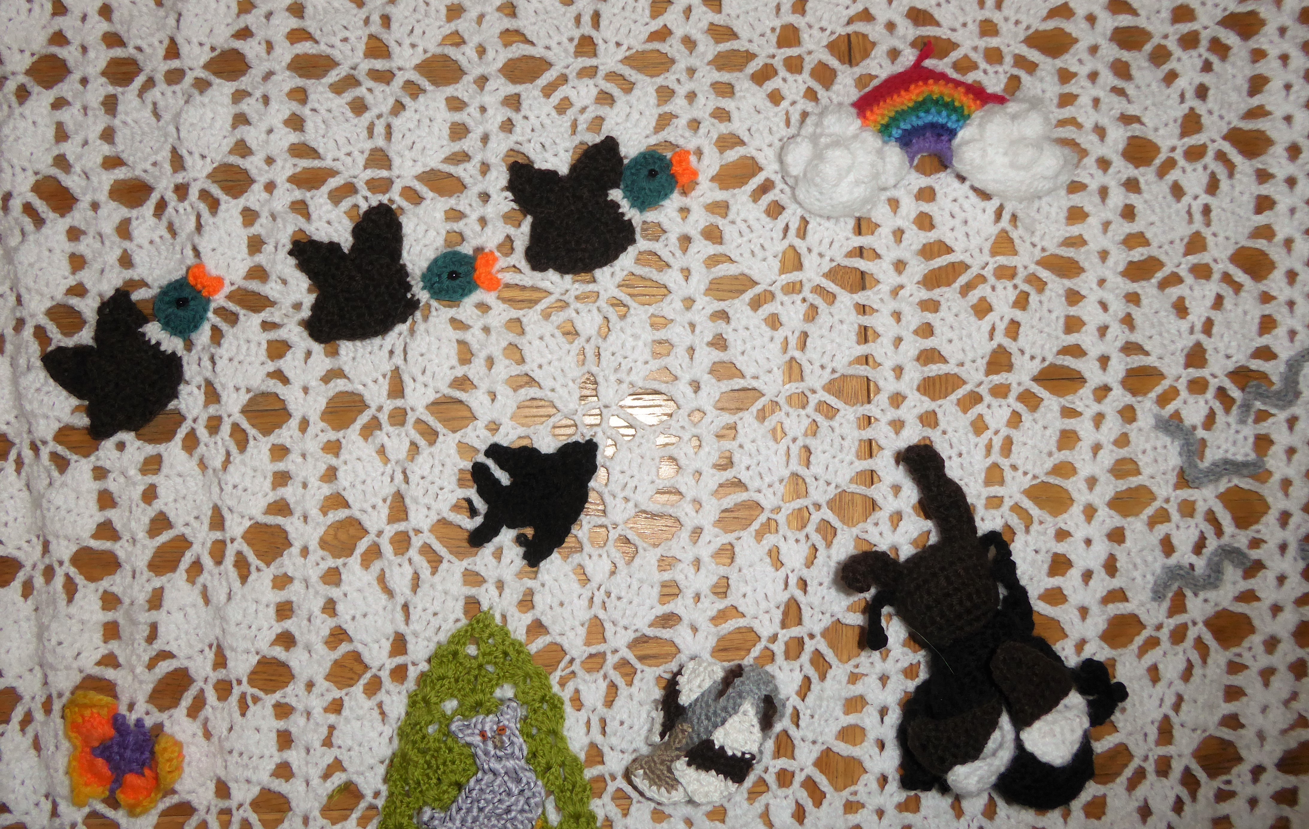 It’s really hard sewing things on straight on the crochet background, so the last little guy is kind of doing his own thing. Good for him.