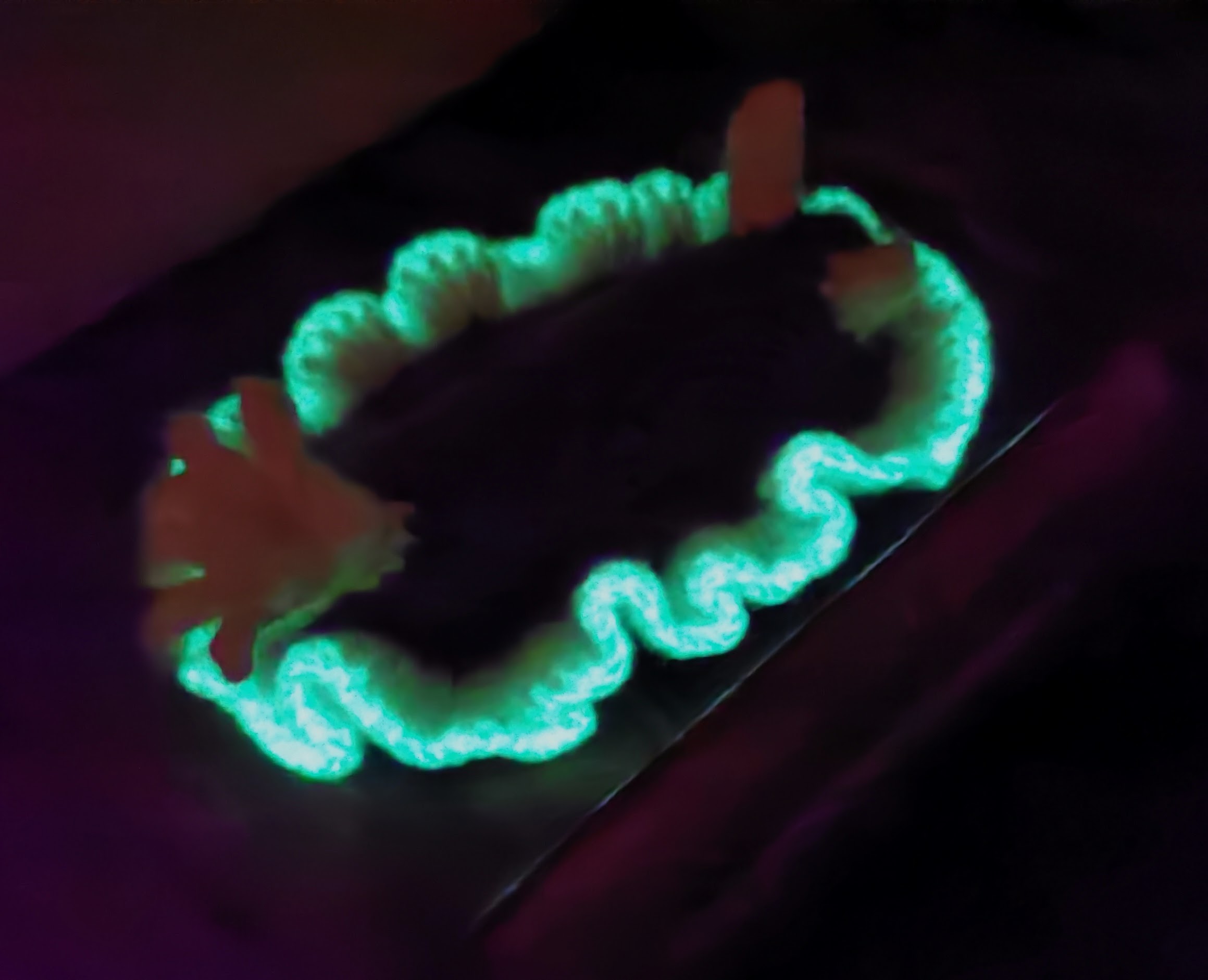 Didn’t get the colours exactly right, and should have made the base of the gills purple. Mine has an extra row of glow-in-the-dark yarn around the frill, just for fun.