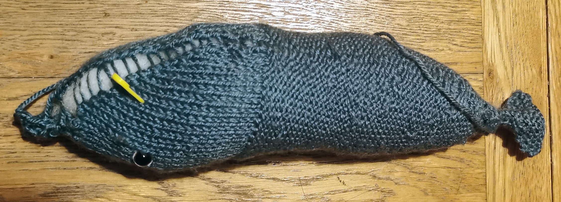 Next up, a dorsal fin. Spent a ridiculous amount of time figuring out how to get the right shape. Please note my dreadful attempt at rib stitch. Did some sewing to tweak the lips a bit, too.
