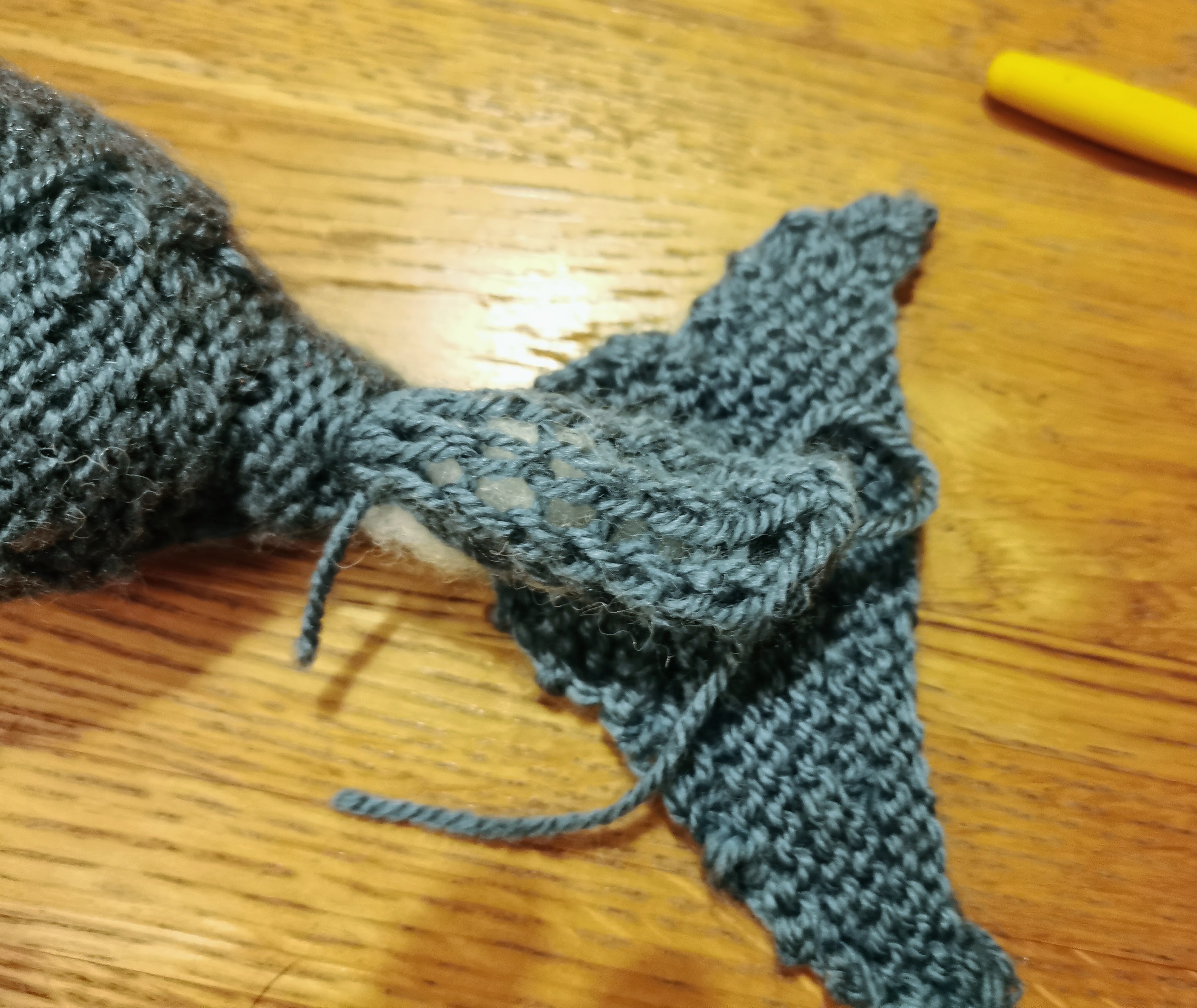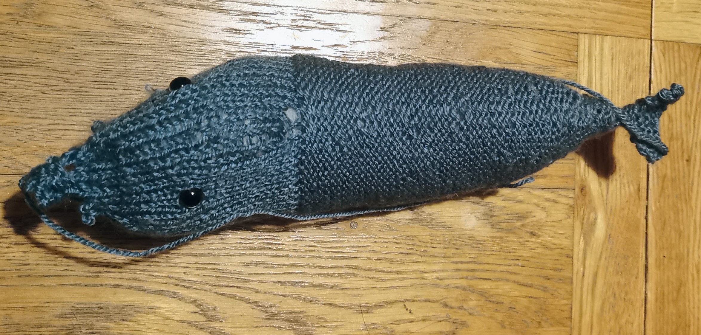 Next, gave him a tail extension. Knitted an extra bit and sewed it on to what was already there. Then knitted a tube on a little loom and stuffed it to provide strength and support, knitted a second side to the tail, and sewed it all together. Decided to use a herring as my guide for looks, so a sneaky bit of running stitch on the tail pulled it into a V shape.