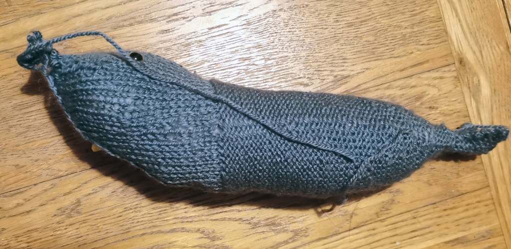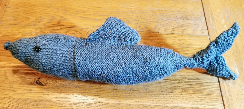 I’ve somehow wildly misinterpreted the instructions, and had huge problems with my technique. The big gaps are where I’ve tried to purl 2 together, I think. In the end I went totally off piste to try and stop the fish being a yard long, and just returned to the pattern for the lips, which I also messed up. It probably didn’t help that I kept losing track of when I’d gone round a whole loop until I put a stitch marker in to help me.*